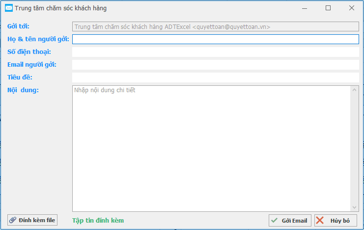 Ngoài ra, phần mềm đã tích hợp sẵn chức năng gởi email, Quý khách có thể dùng chức năng này để gởi email báo lỗi cho công ty Chúng tôi.